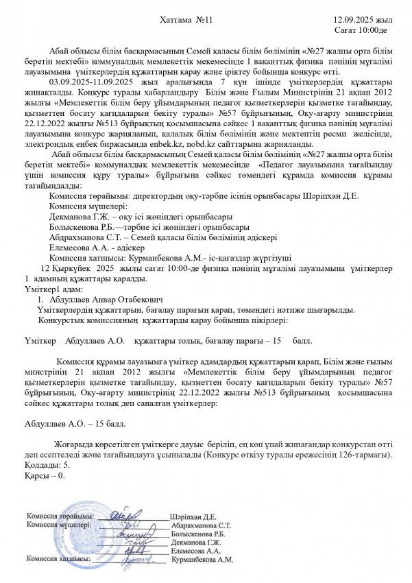 Физика пәнінің мұғалімі лауазымына конкурс нәтижесі » "№ 27 жалпы орта білім беретін мектебі" КММ, Семей қаласы, Абай облысы.