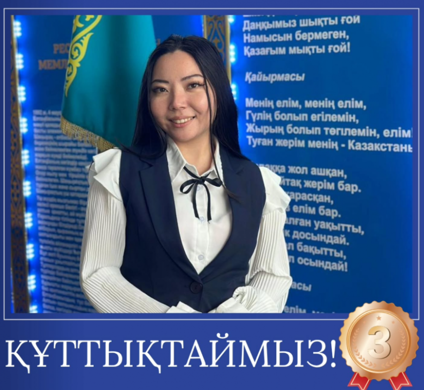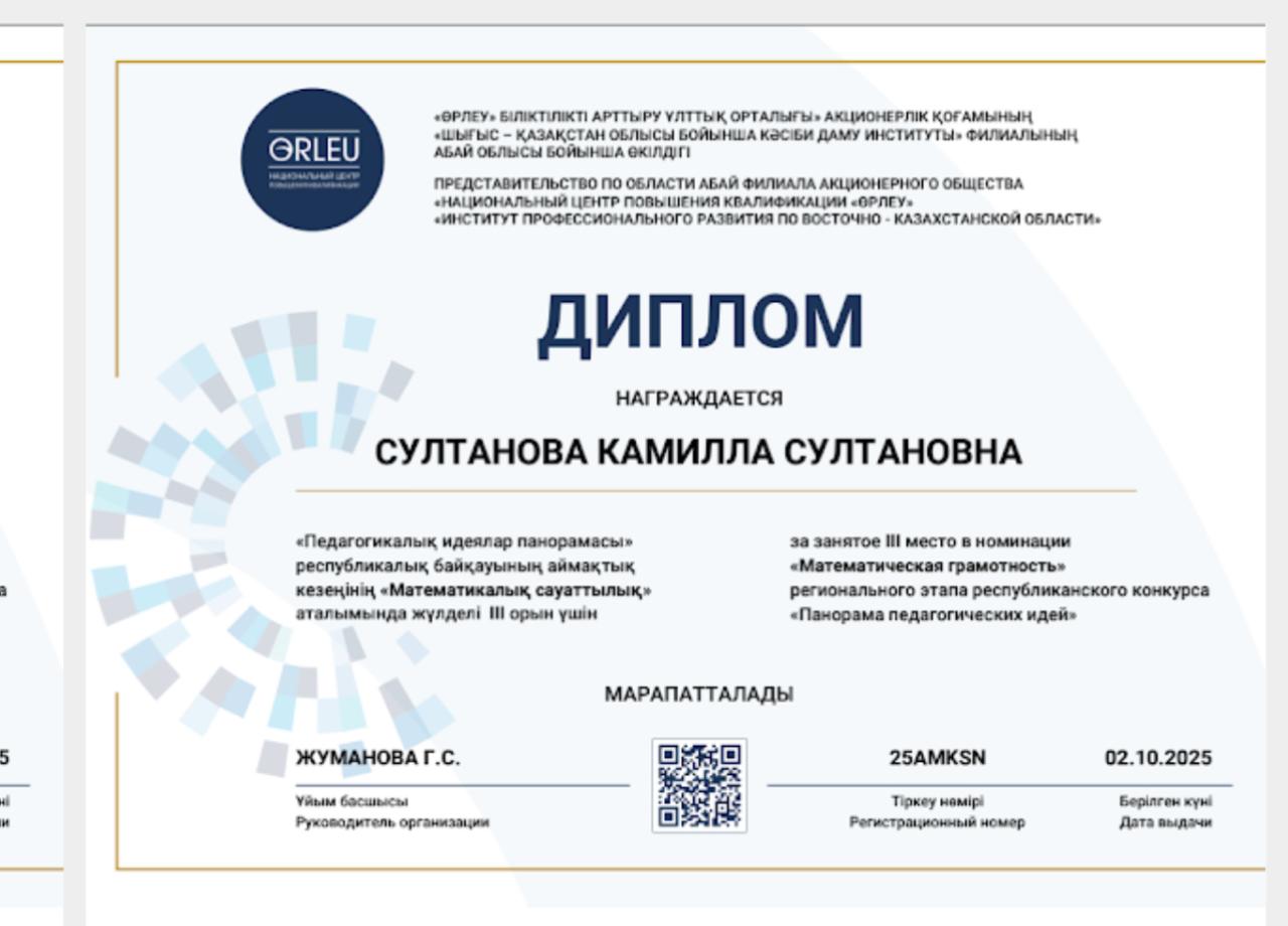 Бастауыш сынып пәнінің мұғалімі Султанова Камилла Султановна 2025 жылғы «ПЕДАГОГИКАЛЫҚ ИДЕЯЛАР ПАНОРАМАСЫ» конкурсының аймақтық кезеңінде "Математикалық сауаттылық" бағыты бойынша жүлделі III орын иеленді. Құттықтаймыз!👏🏻