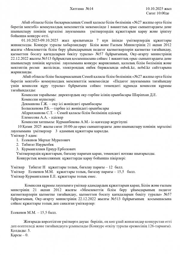 Дене шынықтырыу пәнінің мұғалімі лауазымына конкурс нәтижесі » "№ 27 жалпы орта білім беретін мектебі" КММ, Семей қаласы, Абай облысы.