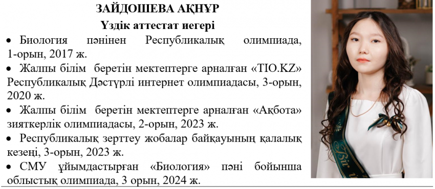 ЗАЙДОШЕВА АҚНҰР - Үздік аттестат иегері » "№ 27 жалпы орта білім беретін мектебі" КММ, Семей қаласы, Абай облысы.