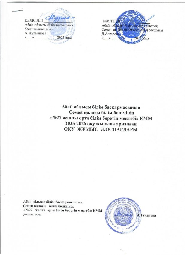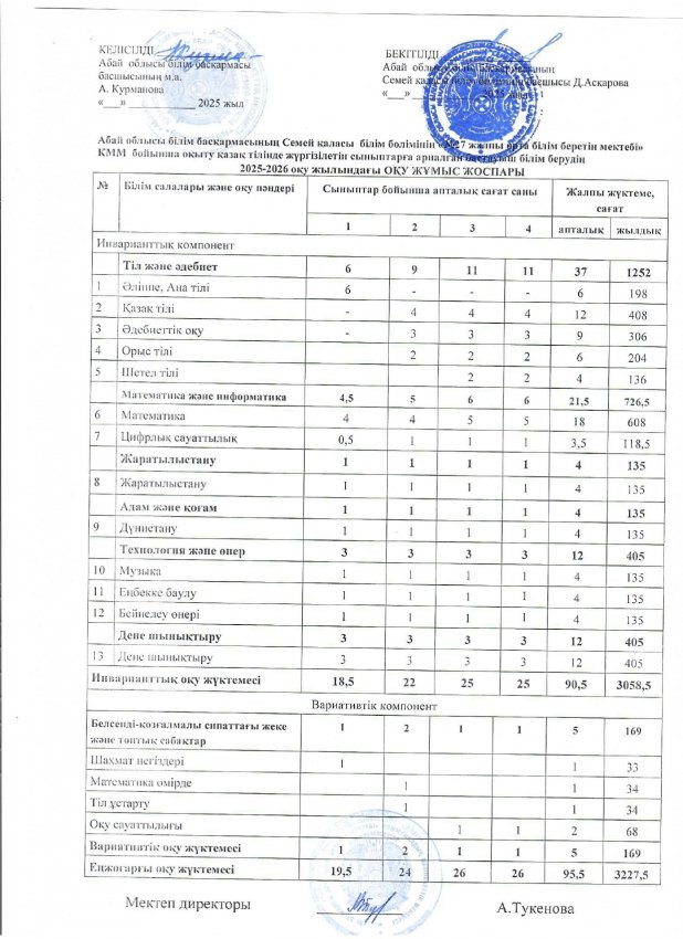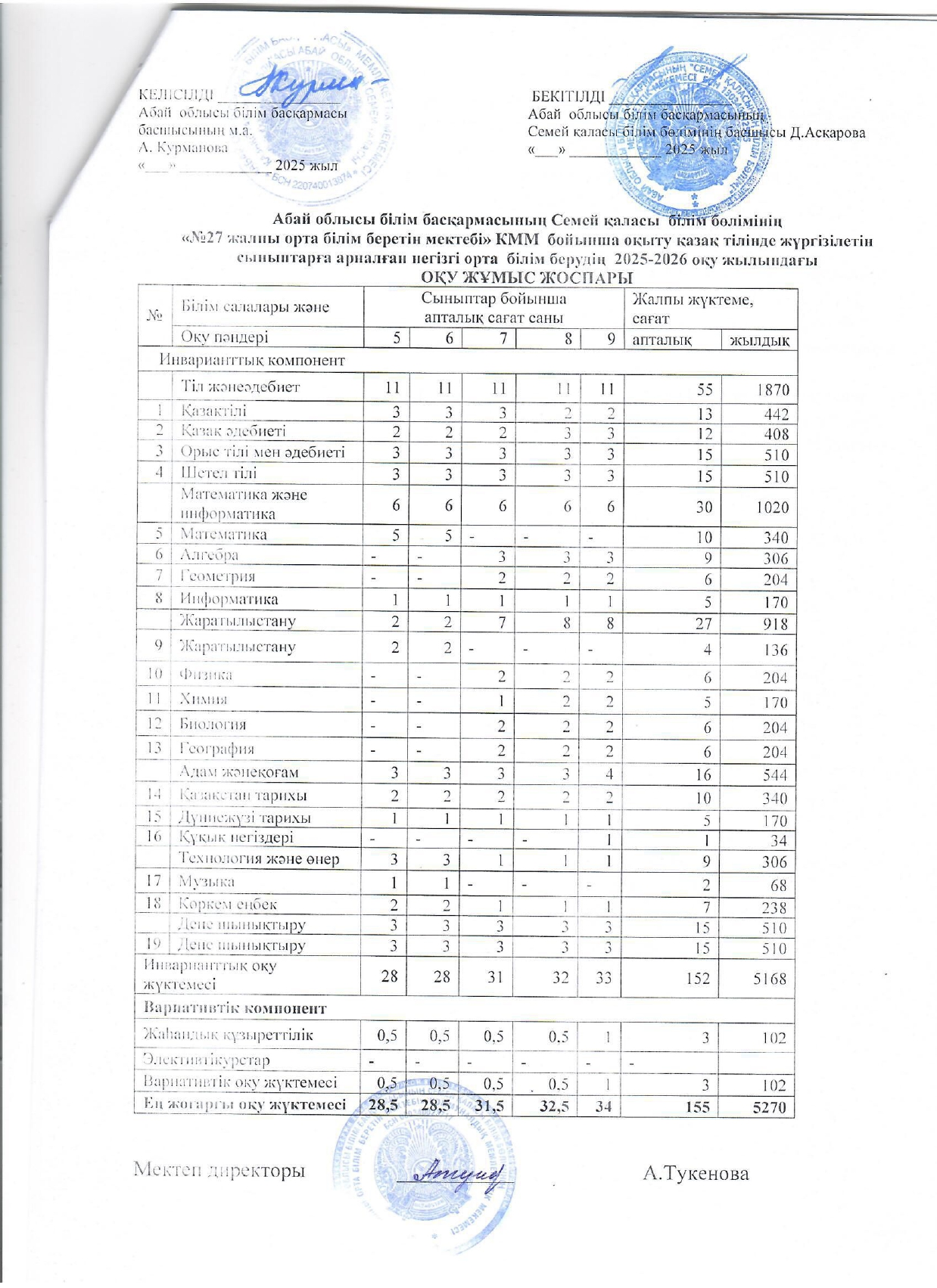 Оқу жұмыс жоспары, 1-11, казақ сыныптары » "№ 27 жалпы орта білім беретін мектебі" КММ, Семей қаласы, Абай облысы.