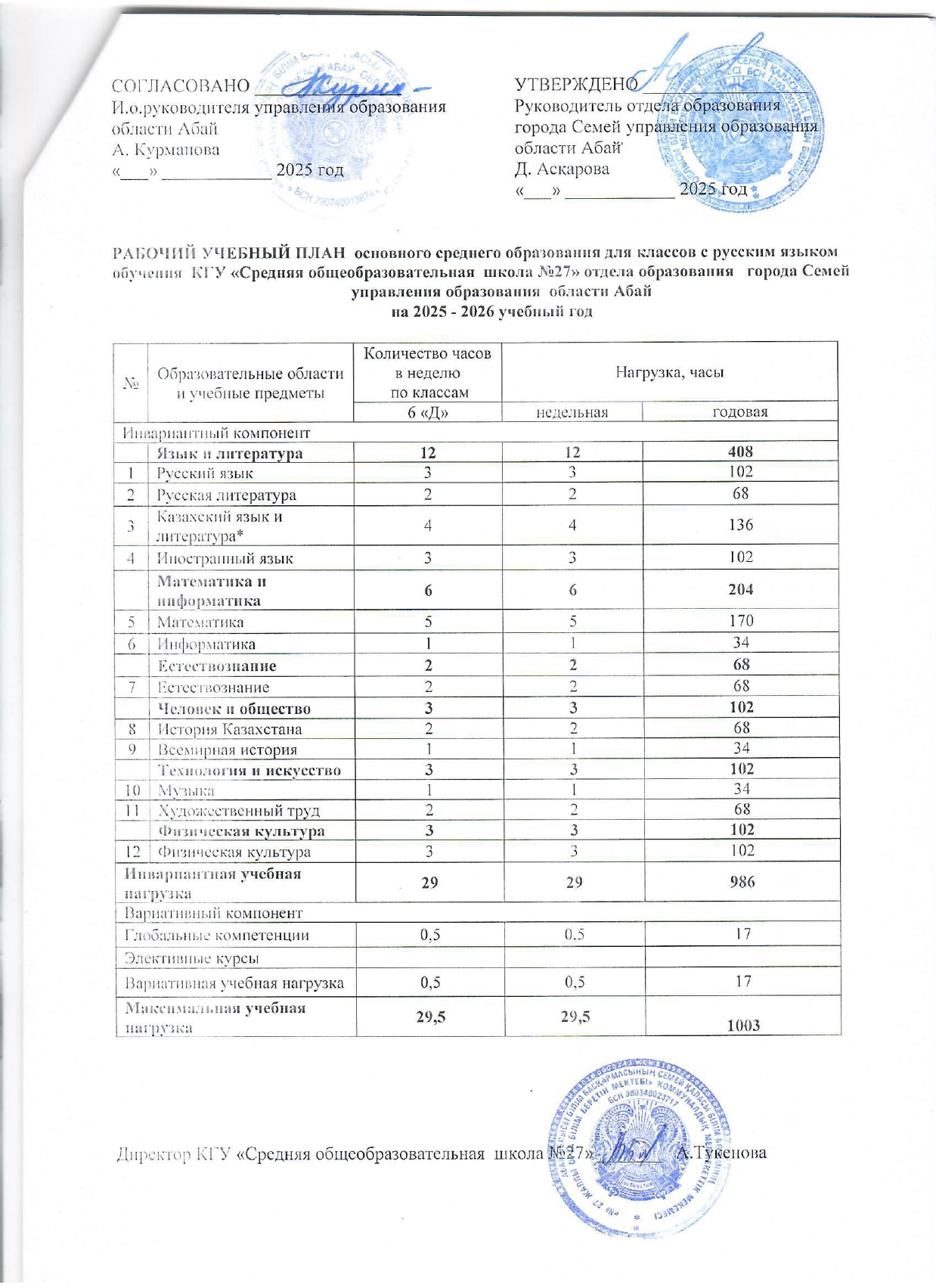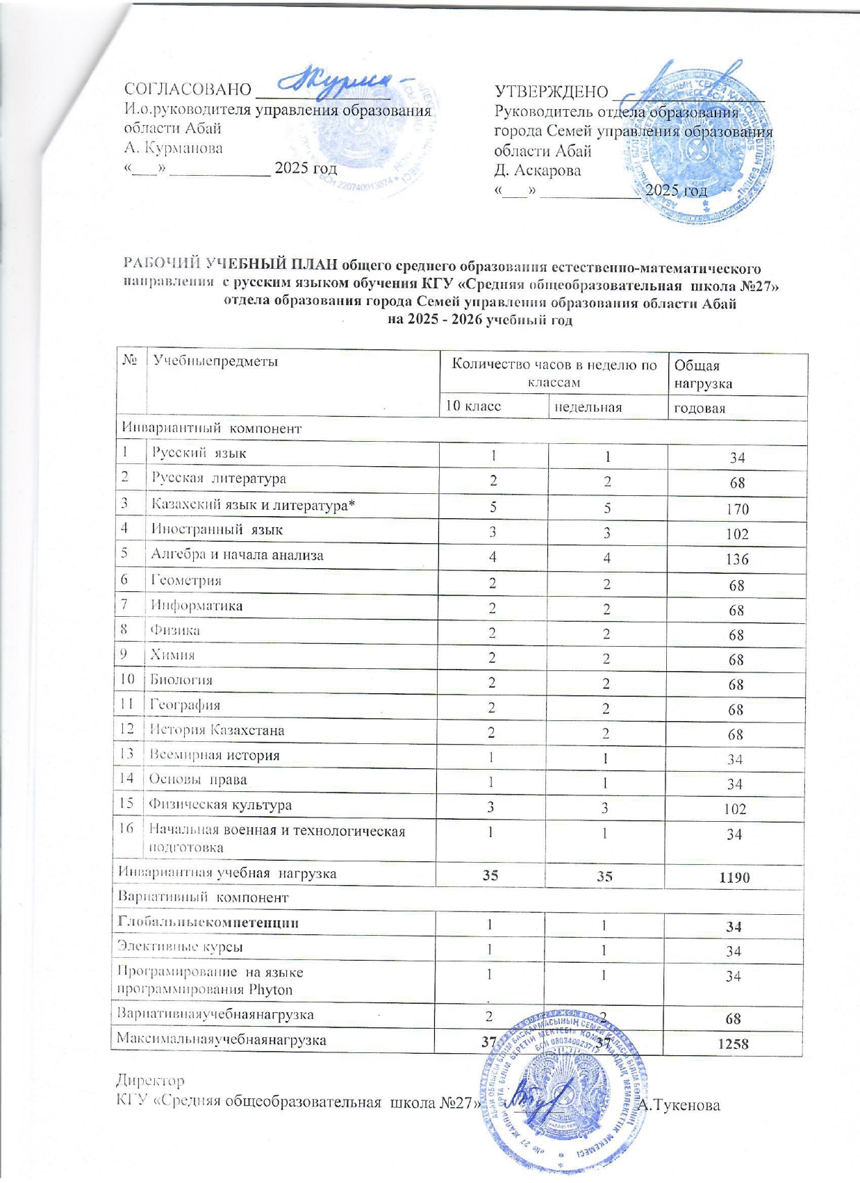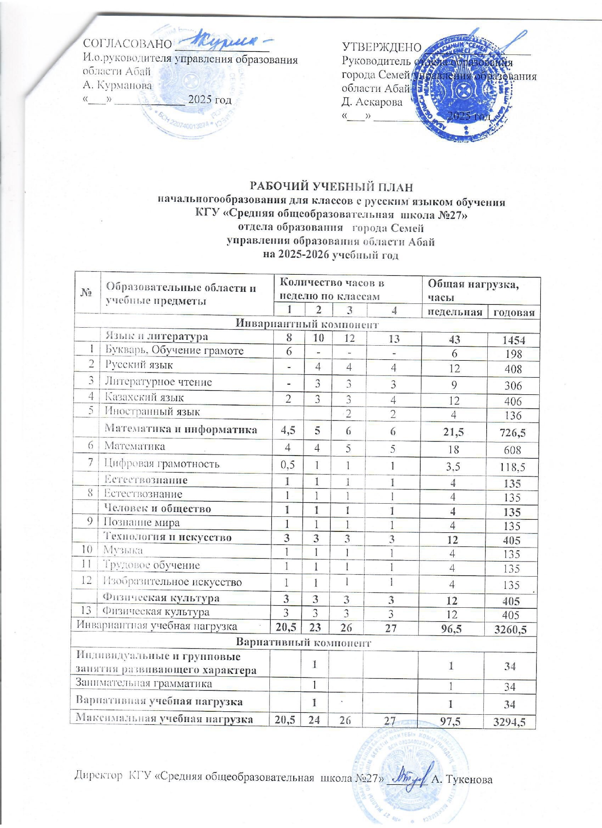 Оқу жұмыс жоспары, 1-11, орыс сыныптары » "№ 27 жалпы орта білім беретін мектебі" КММ, Семей қаласы, Абай облысы.
