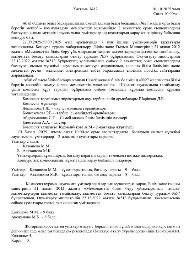 06.11.2025 ж сағат 10:00-де қазақ, орыс сыныптардағы математика  пәнінің  мұғалімі   лауазымына үміткерлердің құжаттарын қарау бойынша конкурстық комиссия отырысы өтеді.