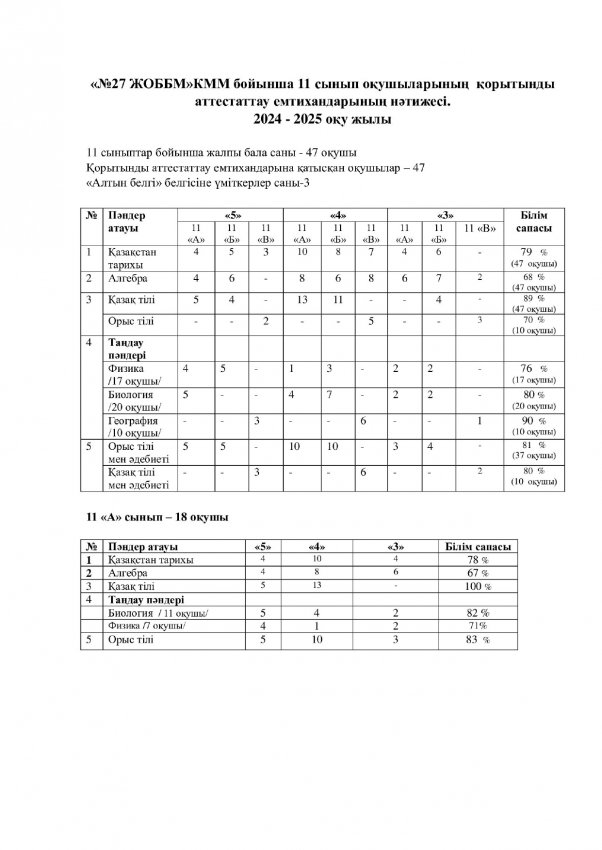 11 сынып. Алгебра және анализ бастамалары пәнінен емтихан. http://semey-27.edu.kz/o-detskom-sade/tv-video/2440-11-synyp-algebra-zhne-analiz-bastamalary-pnnen-emtihan.html http://semey-27.edu.kz/o-detskom-sade/tv-video/2440-11-synyp-algebra-zhne-analiz-bastamalary-pnnen-emtihan.html Жалпы 11-сынып түлектерінің саны — 47, оның ішінде 3 оқушы алтын белгіге үміткер.