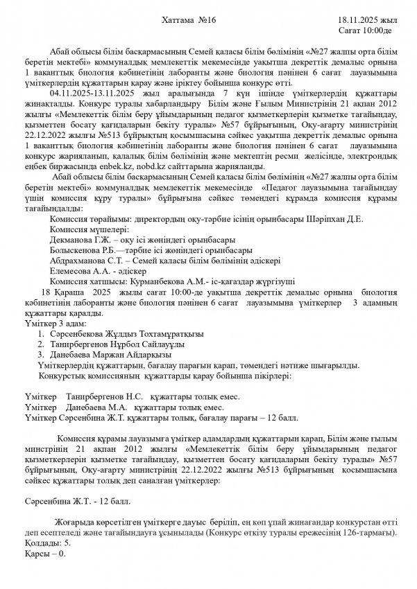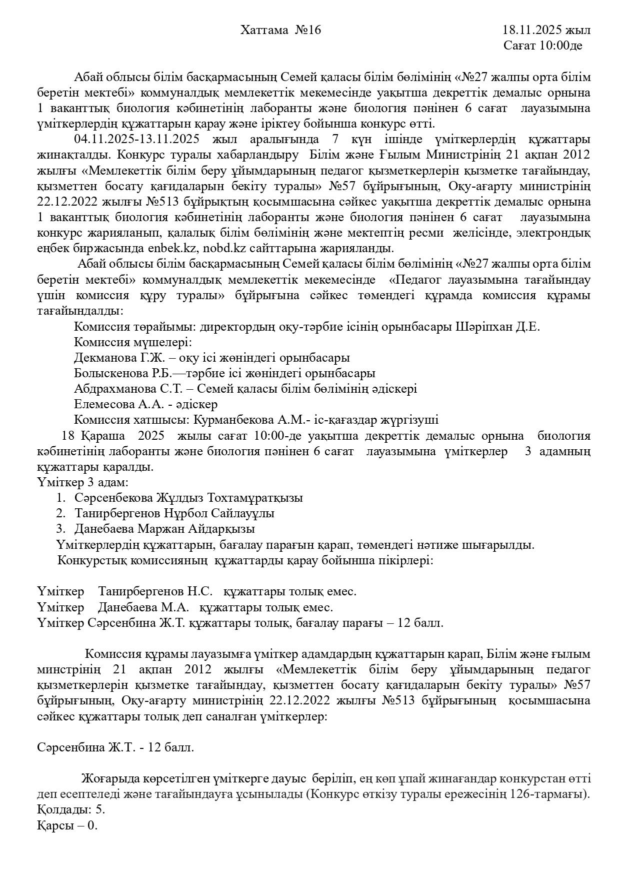 Биология кабинетінің лаборанты лауазымына конкурс нәтижесі » "№ 27 жалпы орта білім беретін мектебі" КММ, Семей қаласы, Абай облысы.