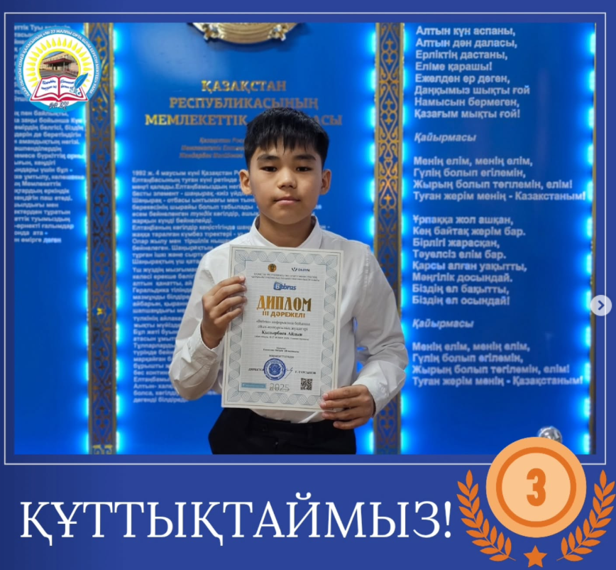 Аталған жетістік – білімге деген қызығушылықтың, логикалық ойлау мен цифрлық сауаттылықтың айқын дәлелі. Осындай табандылық пен ізденіс алдағы уақытта да биік белестерге жетелей берсін!